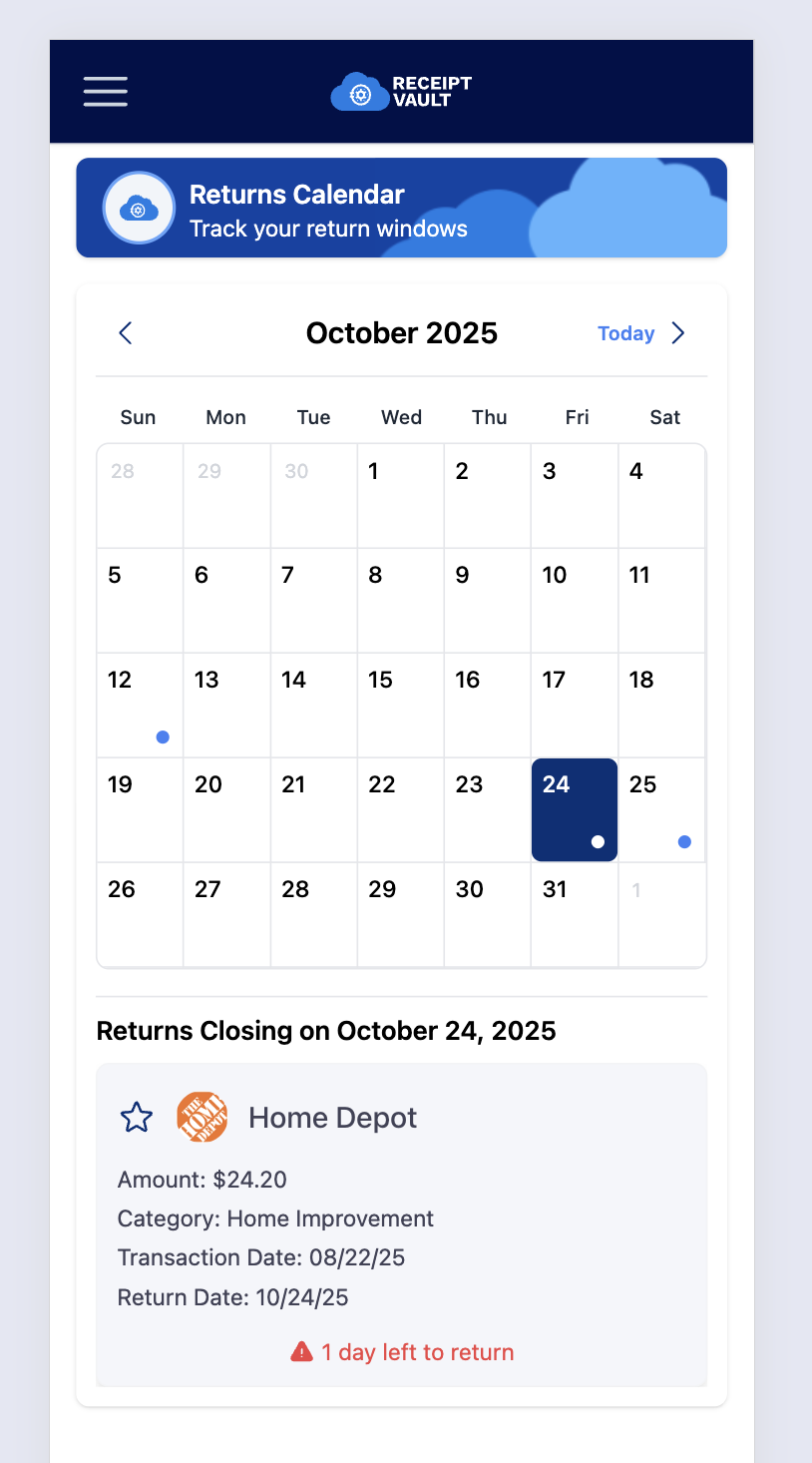 A product returns management software is designed to help you organize your purchase history while also tracking each vendor's return policy, making returns quick and painless. Receipt Vault's solution automatically collects all receipts from your email, populates personalized return windows from those receipts into your Return Calendar, and then sends reminders when a return deadline is approaching. The perfect combination of complete receipt organization with smart return tracking.